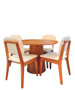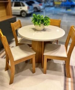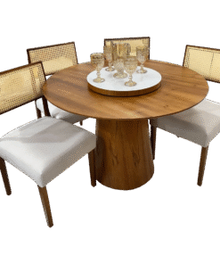 Mesa Redonda Malva 110 Mel + 4 Cadeiras Monalisa Mel/Linho Bege – J SILVA MÓVEIS + AVALON DECOR