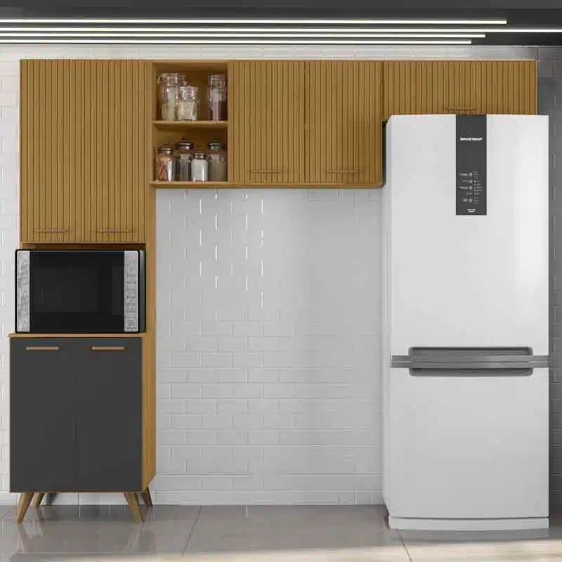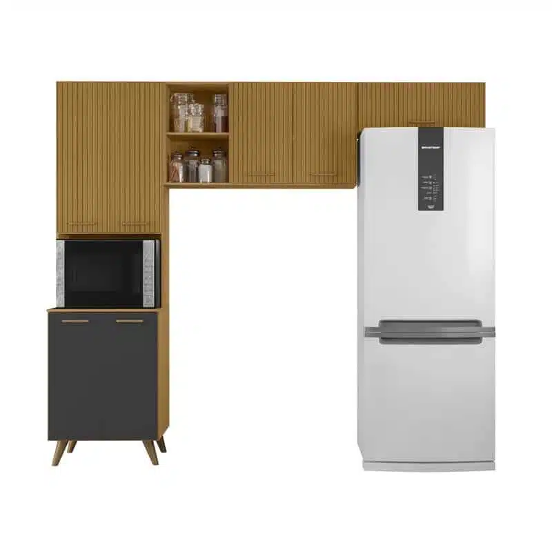 Armário Cozinha Olinda Freijó/Grafite Paneleiro + Aéreo 1.05m + Aéreo de Geladeira Ripado 3D – Poliman