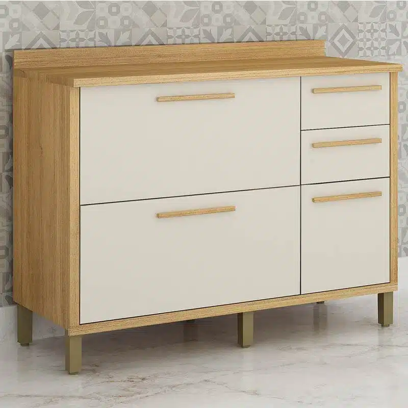 3{%%}Descrição{%%}Balcão Cozinha Torino Cinamomo/Off 3 Portas 2 Gavetas Larg. 1.20m – Valdemoveis