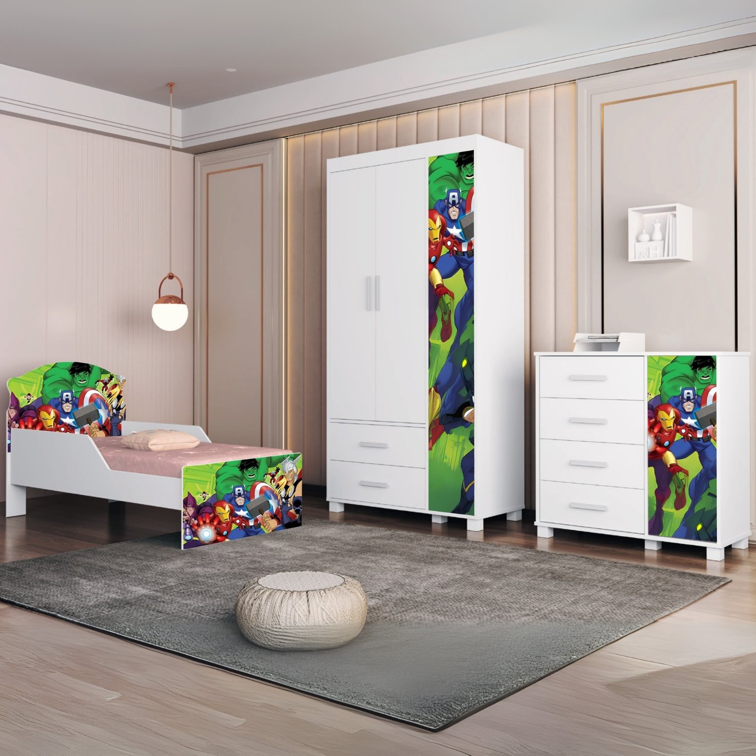 Guarda-Roupa 3 Portas Lívia + Cômoda 4 Gavetas com Sapateira Lívia + Mini Cama Juvenil Lívia (Menino) Vingadores 404188 – MADEC/VJ MÓVEIS