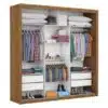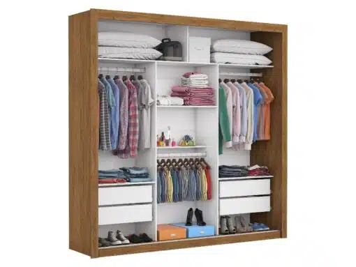 O Guarda Roupa Veneza Plus com 3 portas de correr, 2.08m de altura, 1.85m de largura e 0.46cm de profundidade, combinado com 4 gavetas, 4 prateleiras e 3 cabideiros, deixa o produto com uma divisão funcional capaz de proporcionar ao cliente acomodar todas as suas roupas de maneira mais organizada e com mais visibilidade.
