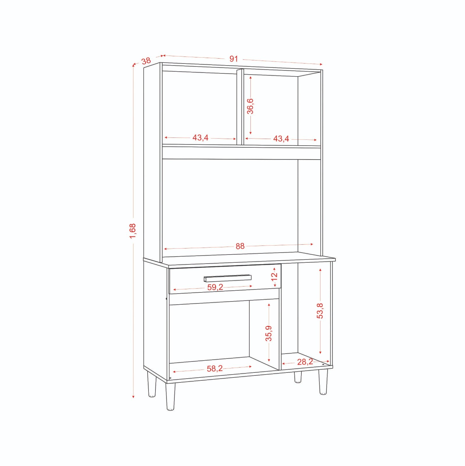 – Uma gaveta com corrediças metálicas