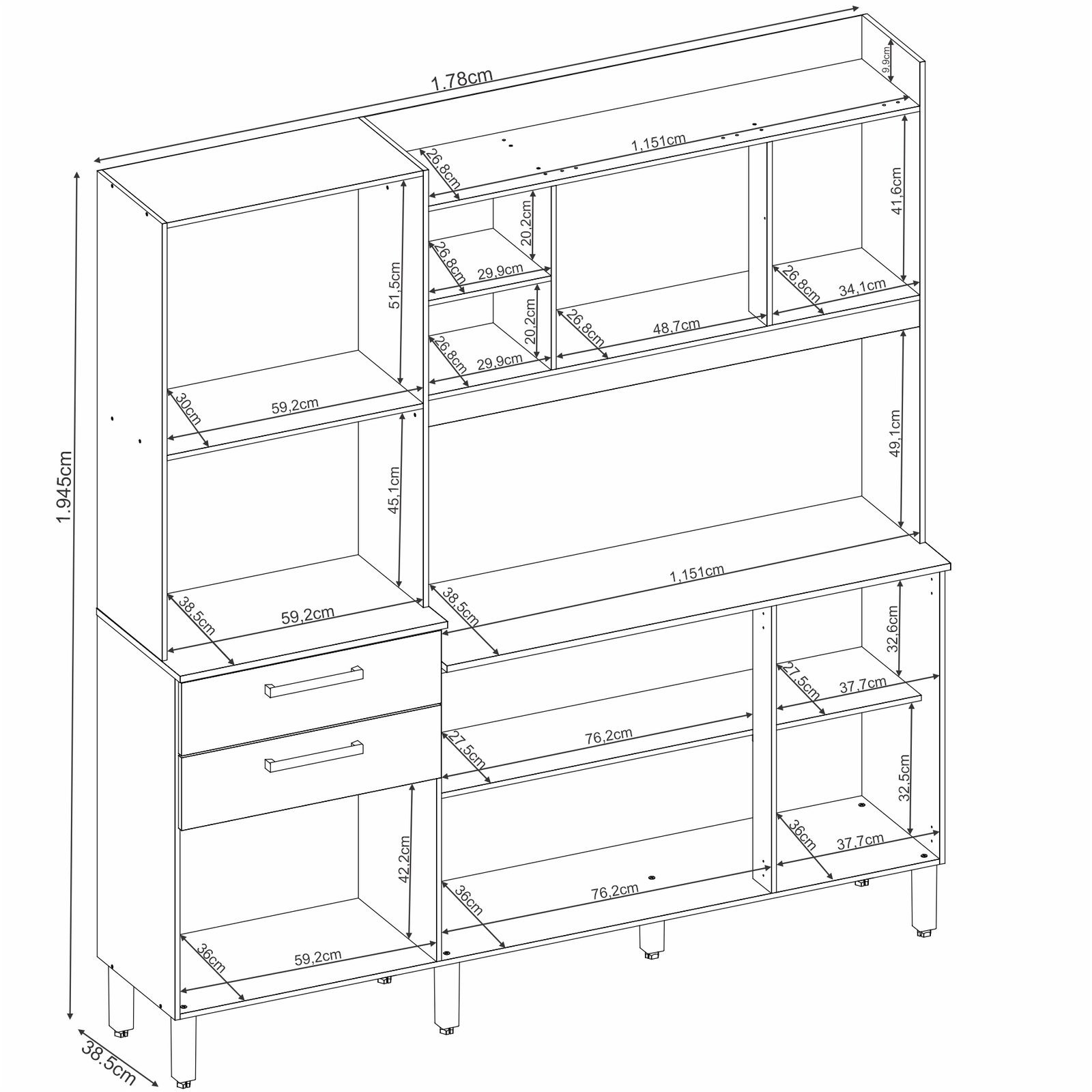 – Espaço para microondas 45 cm x 59 cm x 38 cm (AxLxP)