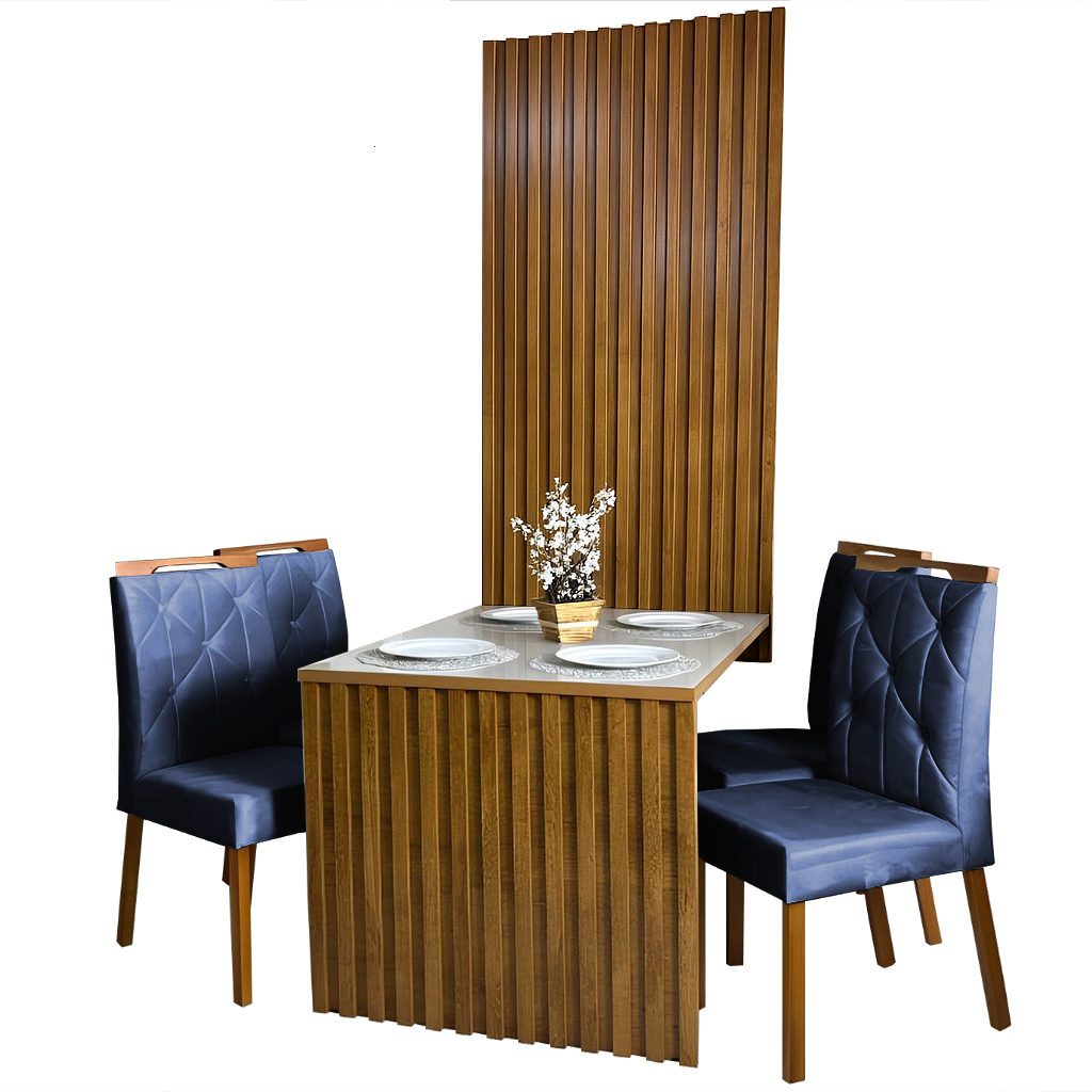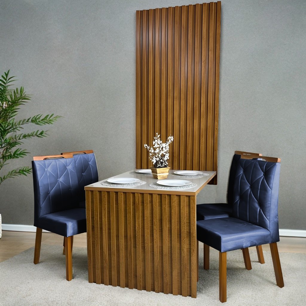 Mesa Cancun 120 Cinamomo/Off White com 4 Cadeiras Yasmim Veludo Azul – CEL MÓVEIS + KM DECOR