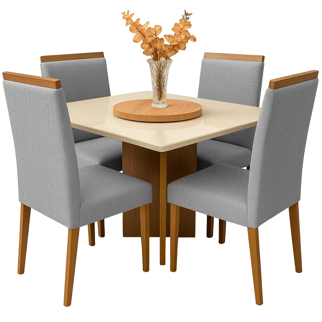 Mesa Salinas 120 Cinamomo/Off White com 4 Cadeiras Samantha 05 Veludo Cinza Prata 1013 – AVALON DECOR + CARVALHO DECOR