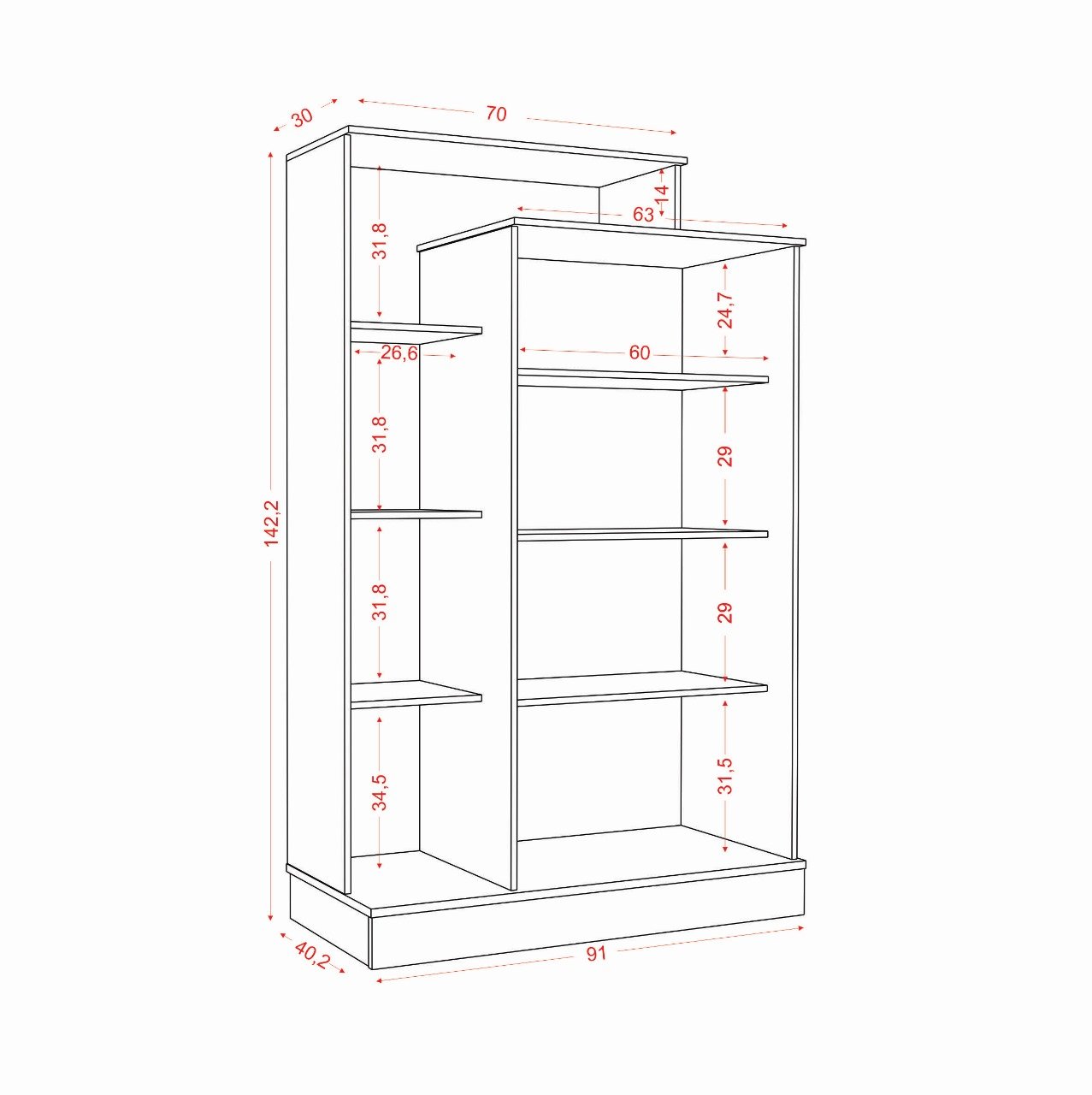– Três prateleiras externas e três internas