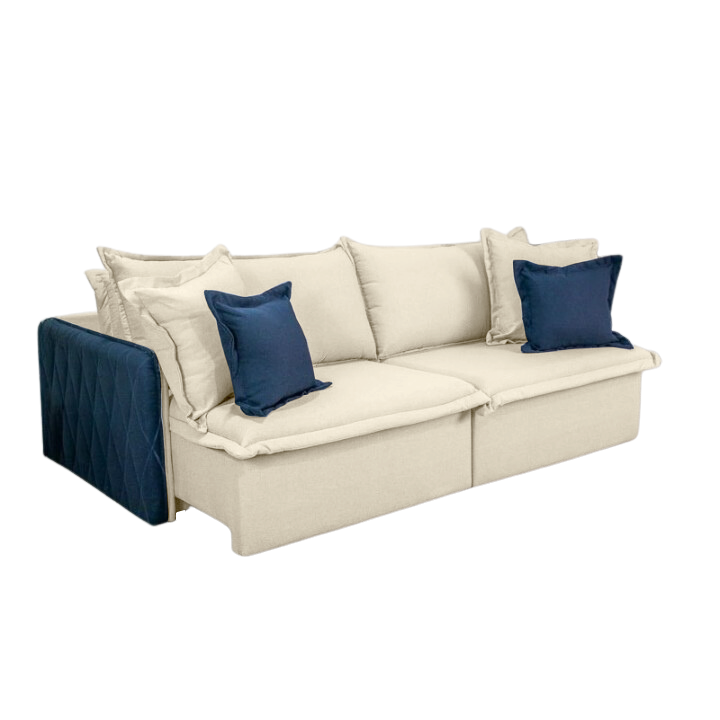 Sofá Cama Retrátil Blog Veludo Marfim/Azul – INNOVE ESTOFADOS