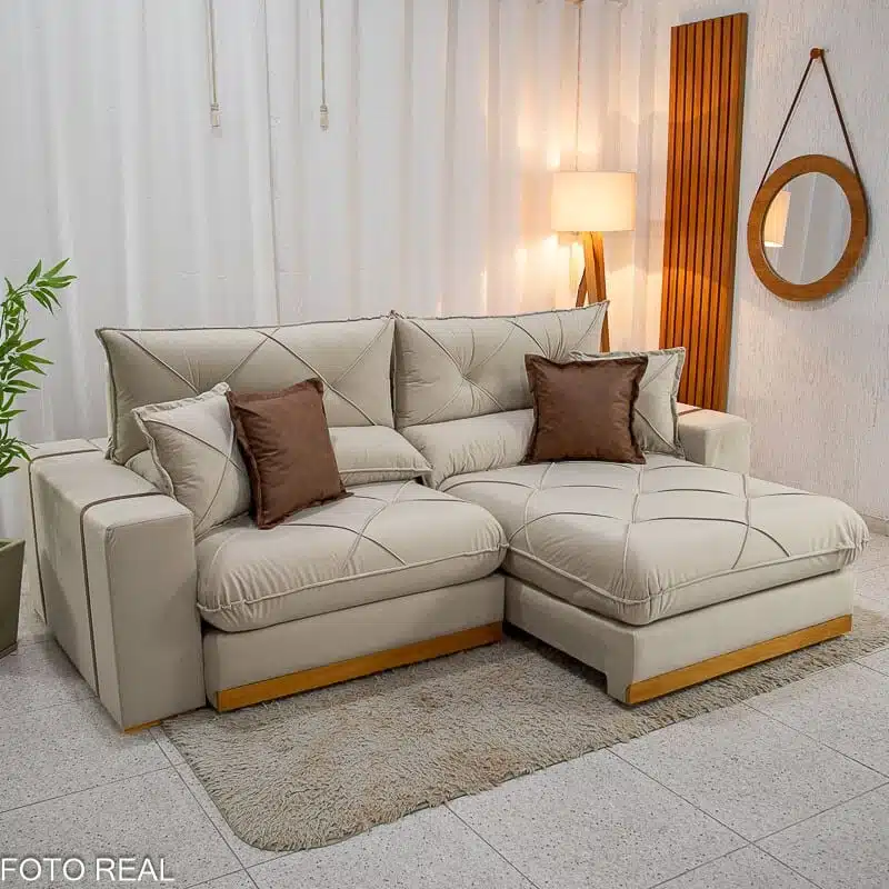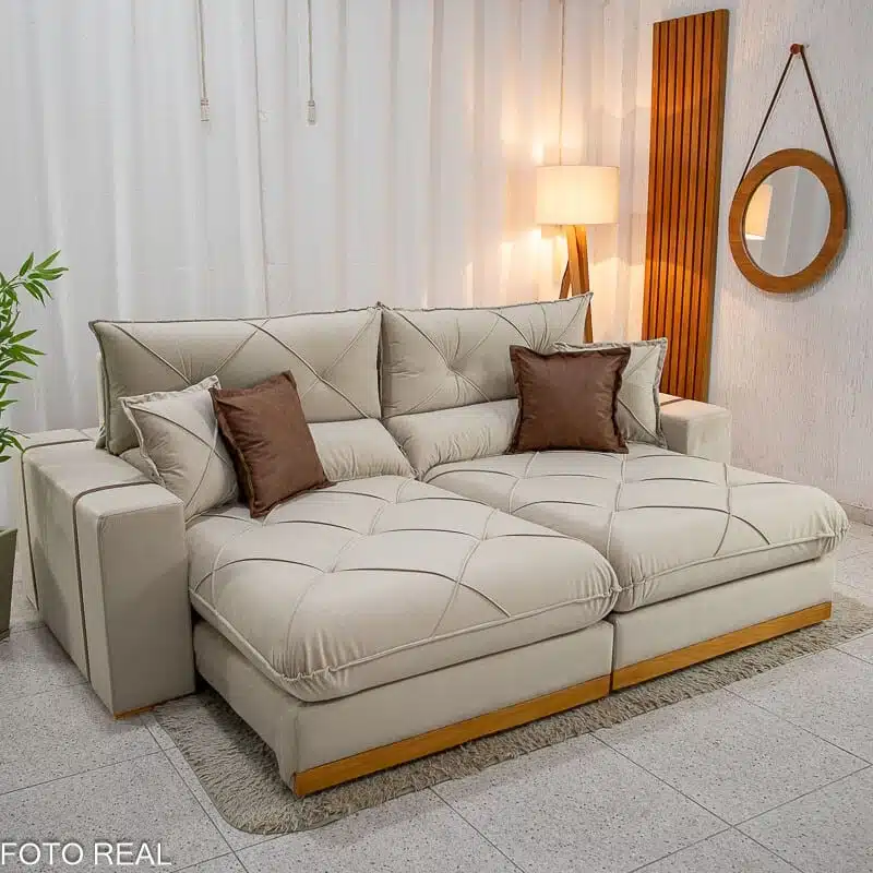 3{%%}Descrição{%%}Sofá Retrátil Reclinável Gran Bello 2.50m Veludo Bege Claro – Molas Ensacadas Pocket