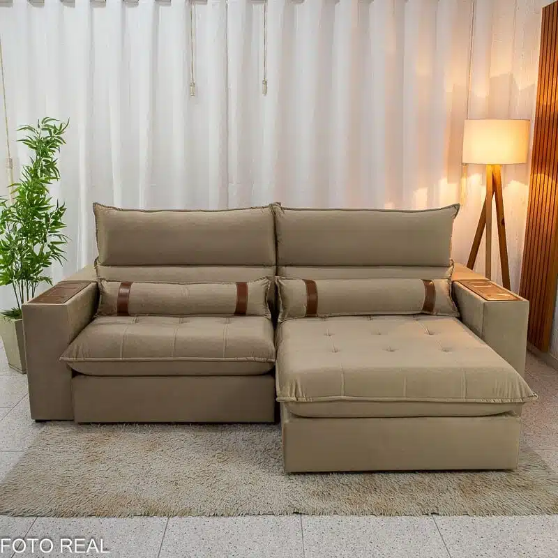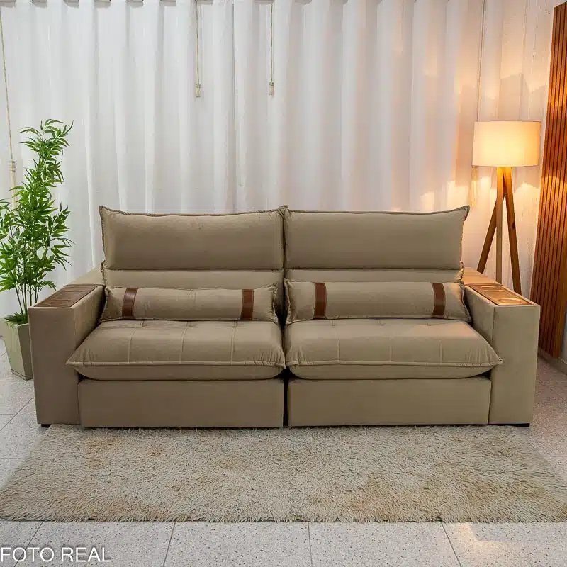 3{%%}Descrição{%%}Sofá Retrátil Reclinável Ravello 2.50m Veludo Bege 3040/04 – Molas Pockets